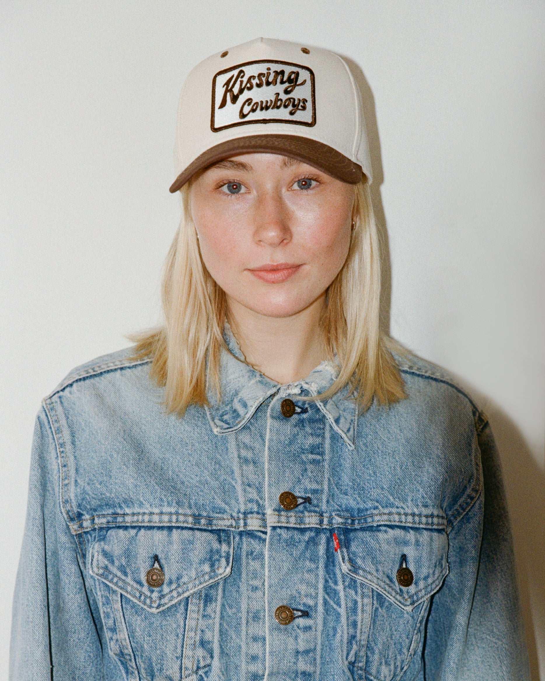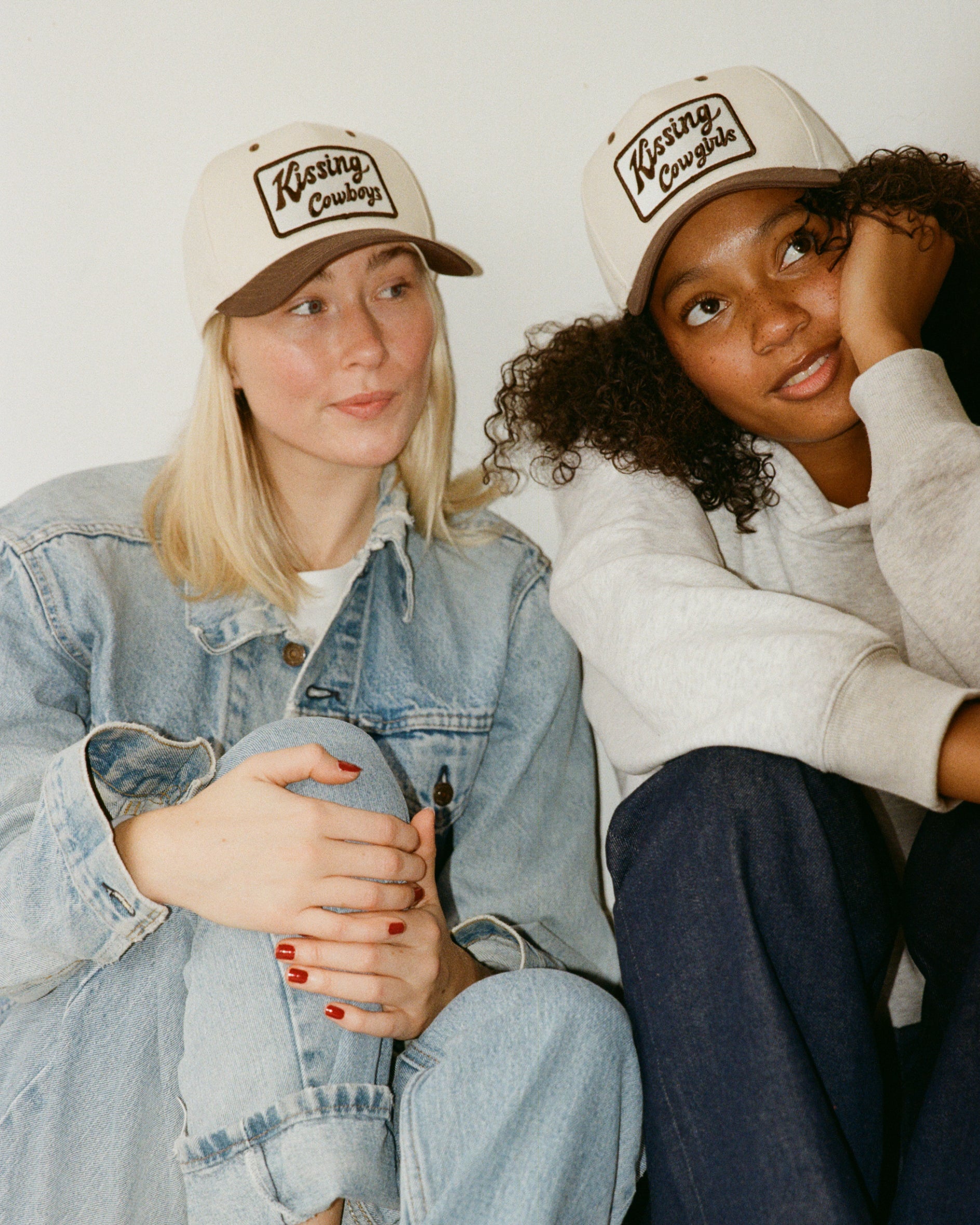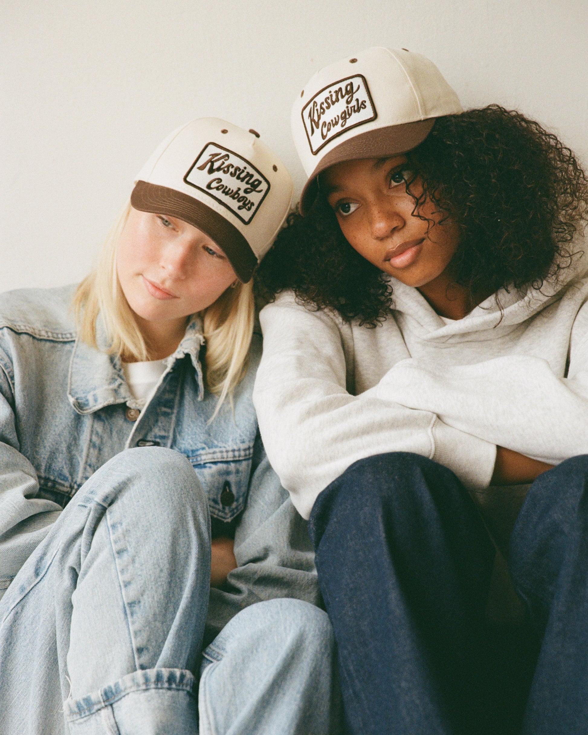 5 panel cotton snap back in brown and cream with our original Kissing Cowboys patch